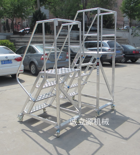 登高梯的一麵設有台階,供使用者登上平台,平台另三麵配有護欄保證作業者的安全。平台作業麵一般大小可容納1-2人站立、轉身、yidong。shiyongzhekezaidenggaochedepingtaishangwanchengconghuojiadenggaochuduiquwupindengdongzuo。lingwai,denggaochepeiyoujiaolun,kegongshiyongzhetuilazhuanxiangyidong,fangbiankuaijie。qizhongyouqianjiaolunshangpeibeiyoulunsha,shazhuhou,denggaotigudingbukeyidong,shiyongzhekeanquanfangxindedenggaocaozuo。